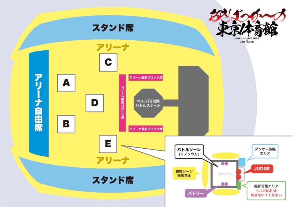 -アリーナ外およびスタンド席外(2on2バトルが見えないエリア)では常時撮影可能です。